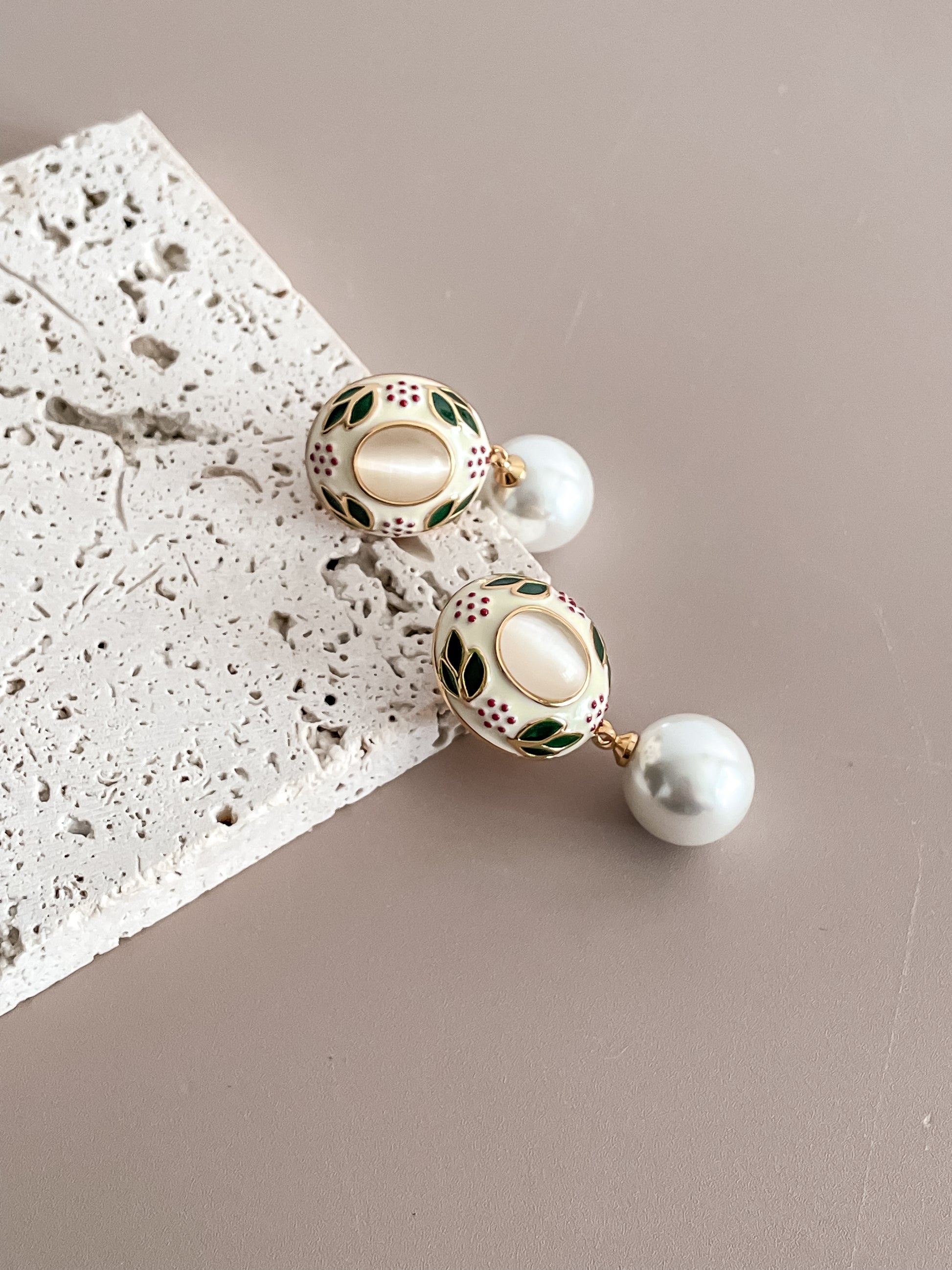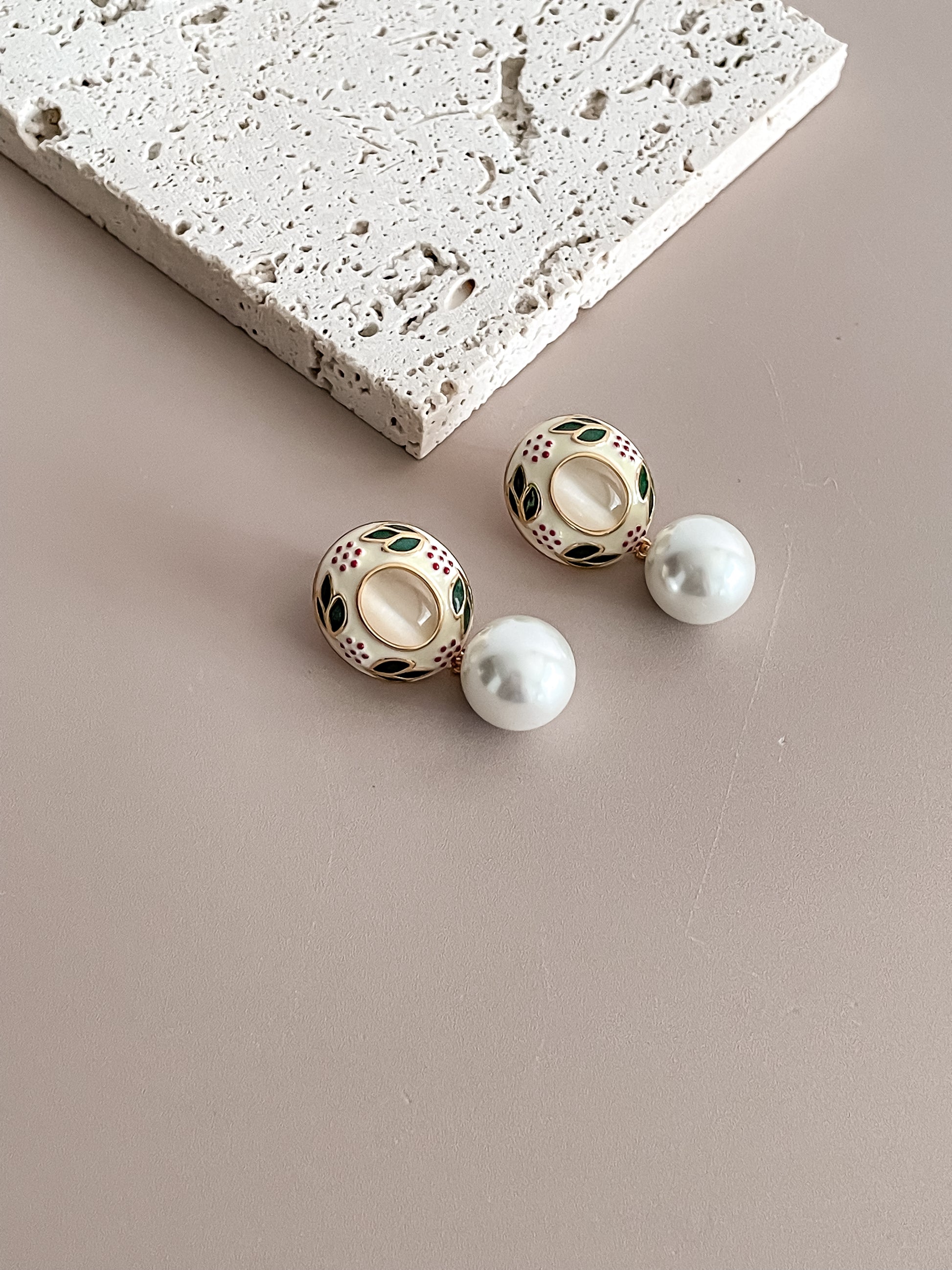 Leaf & Flower Enamel Glazed Earrings w/ Pearl