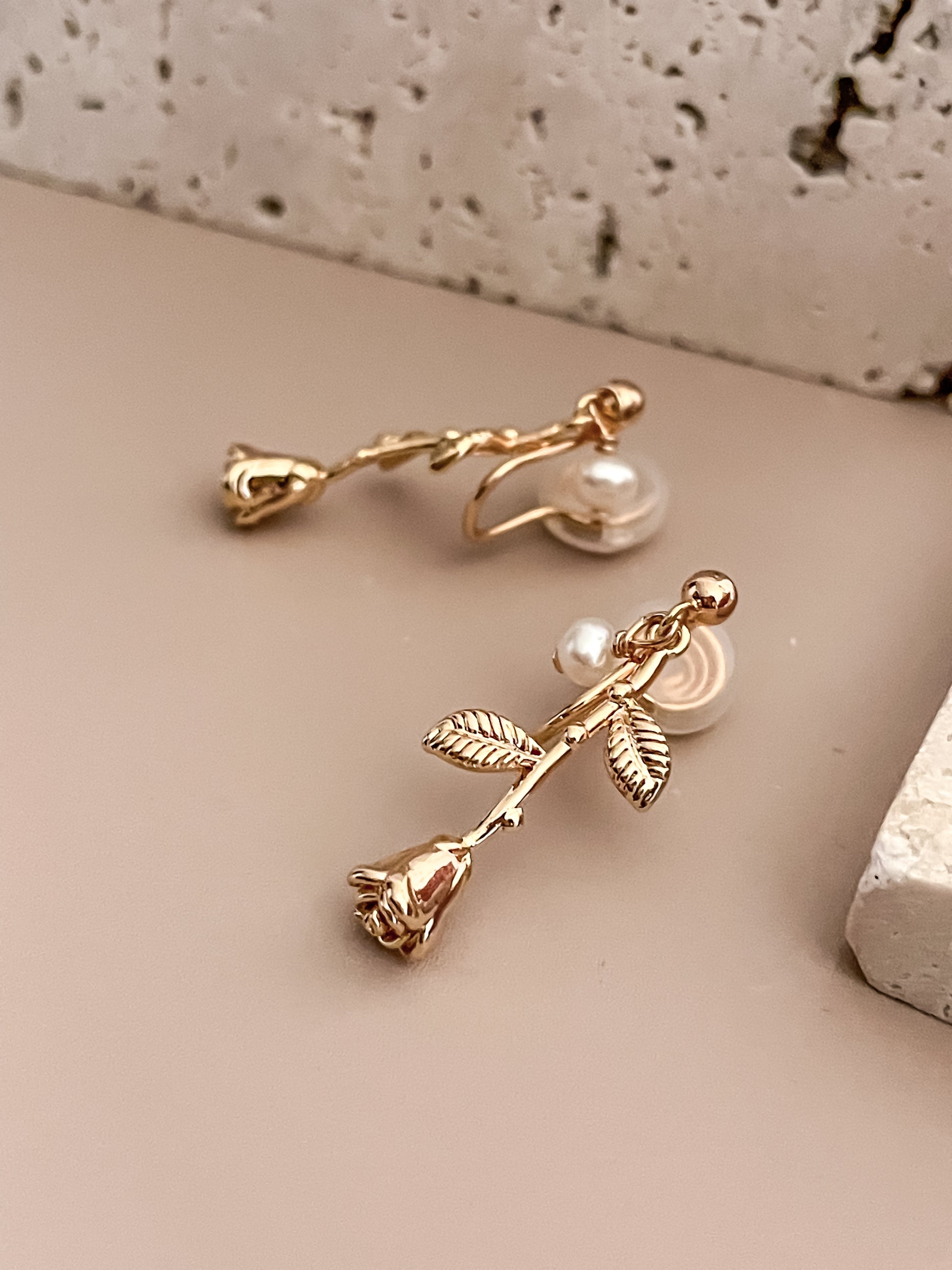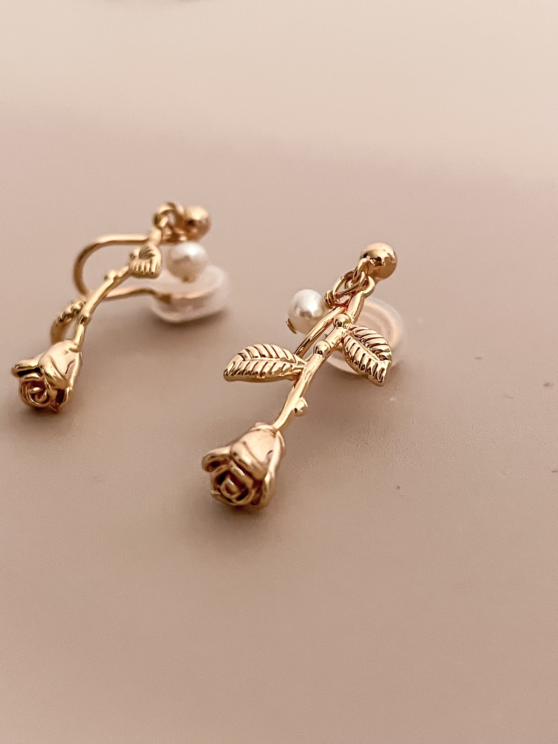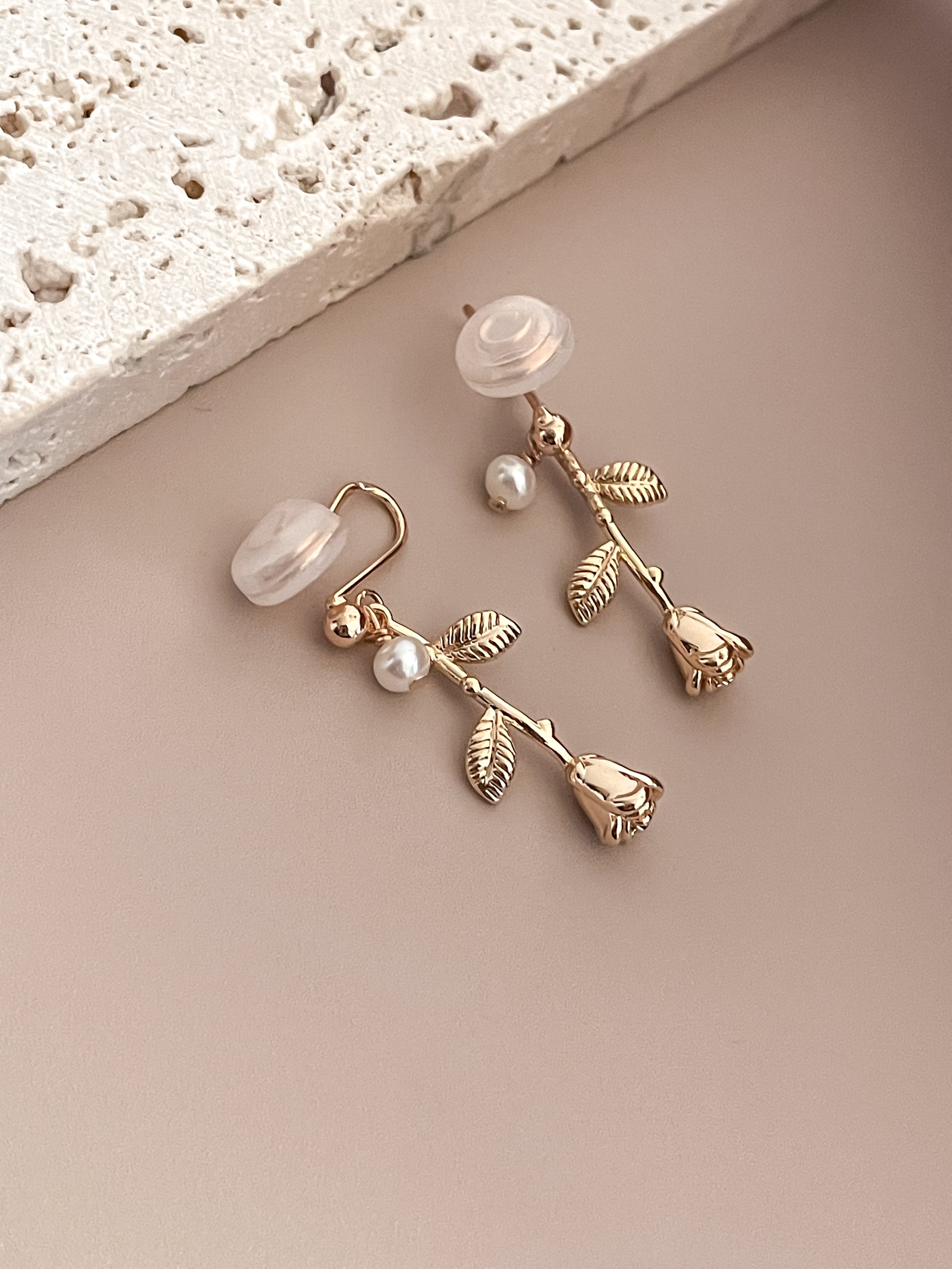 Romantic 14K Gold Plated Rose Stem w/ Freshwater Pearl Pendant Earrings
