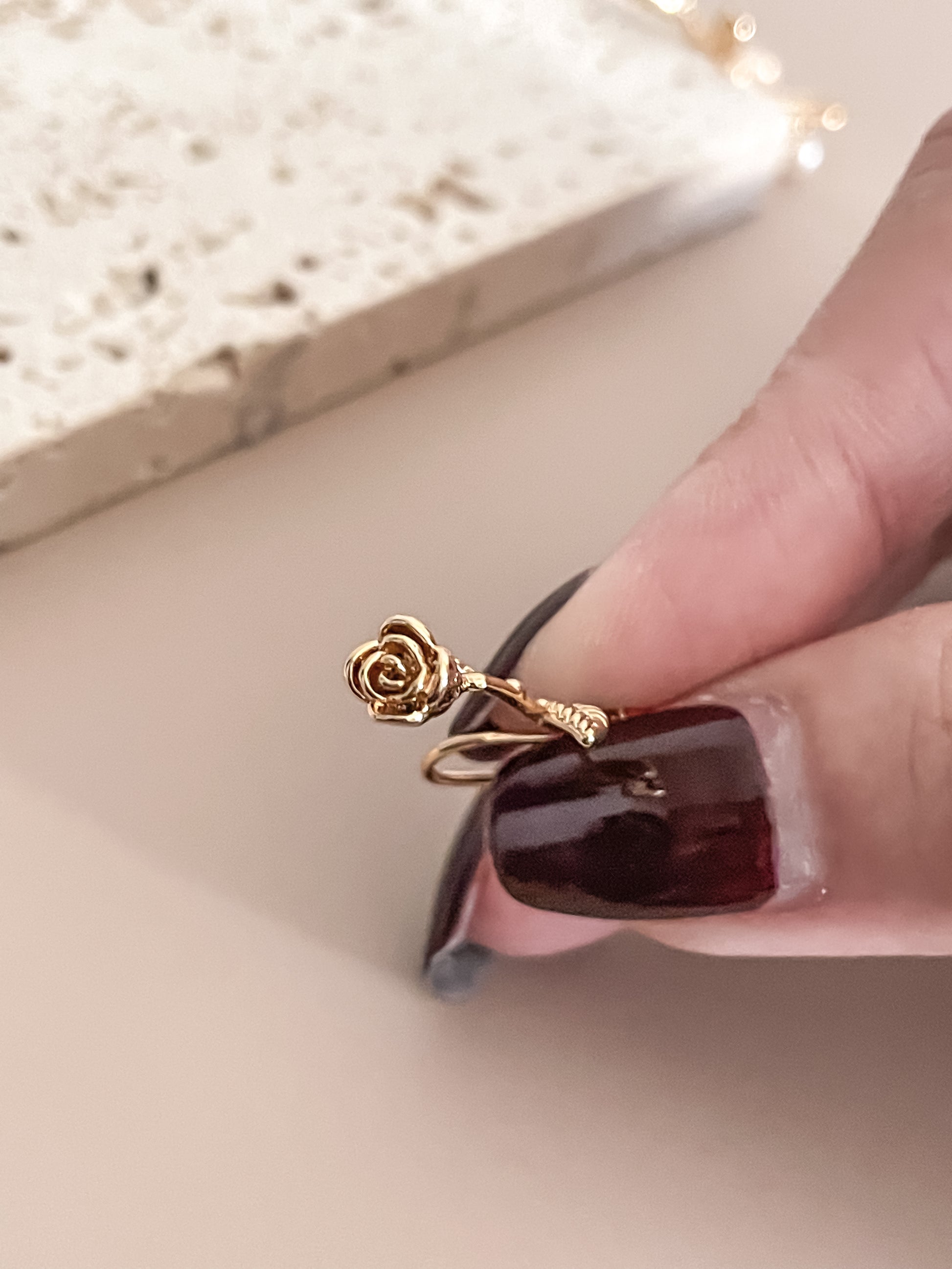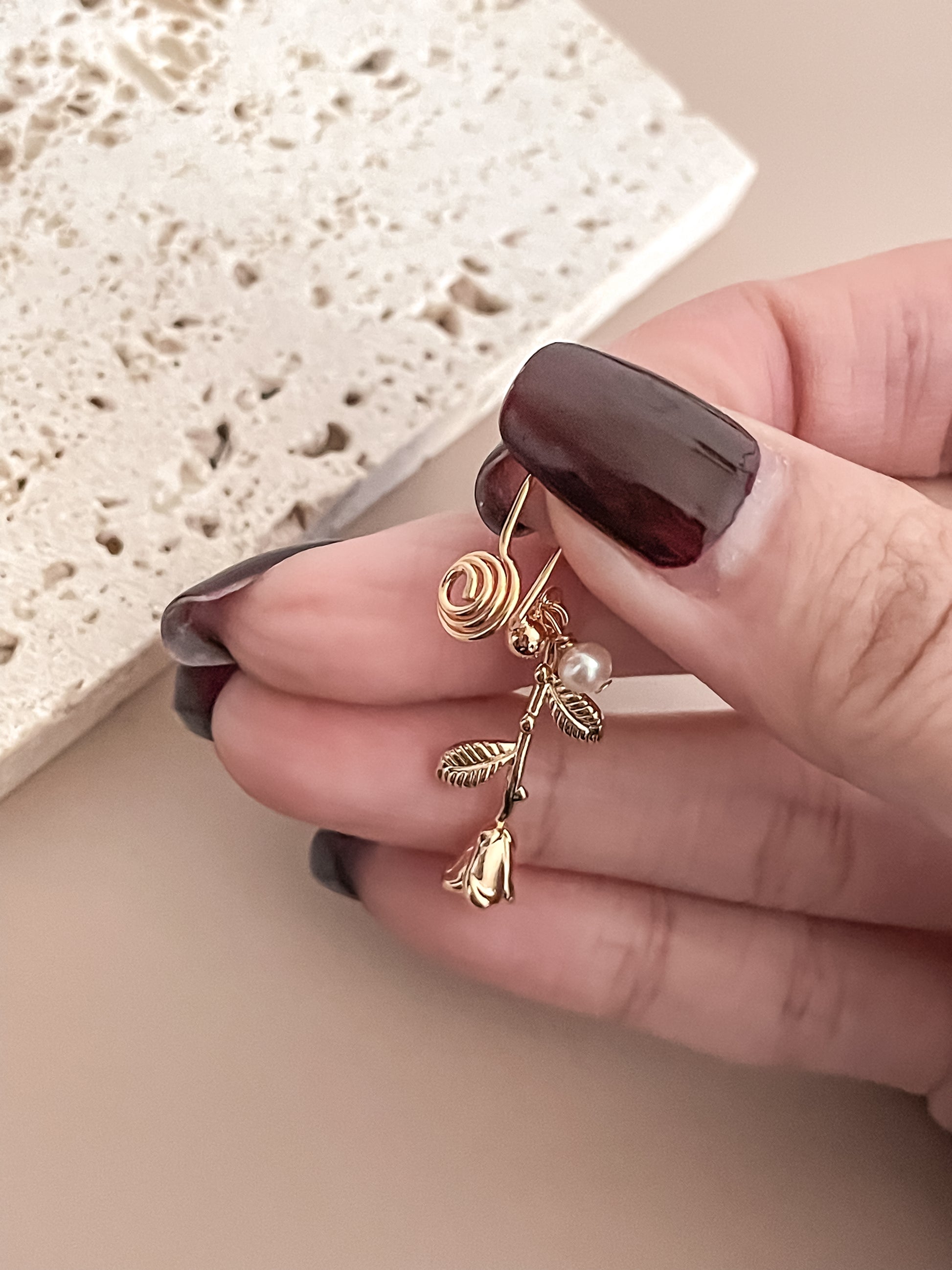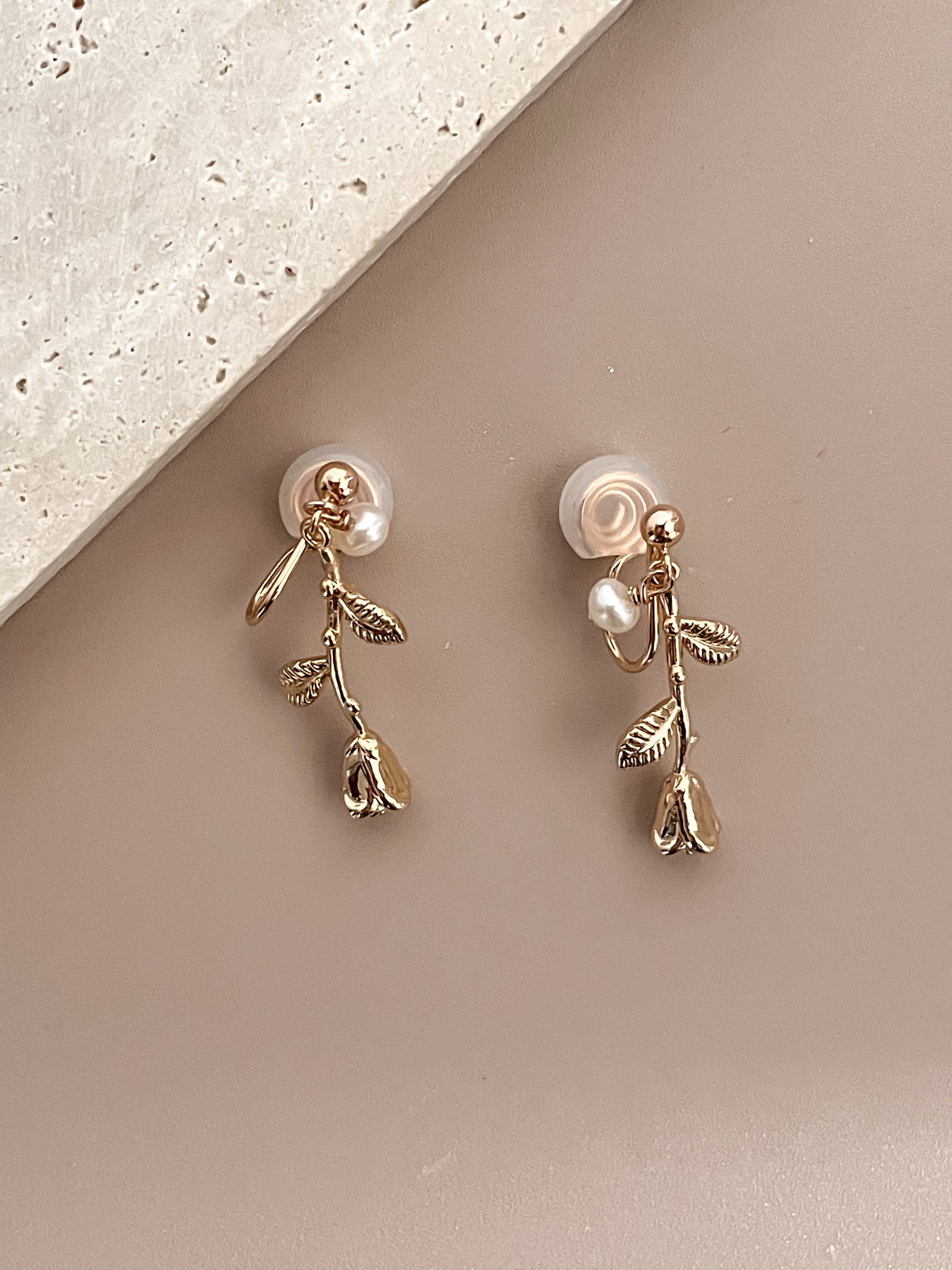 Romantic 14K Gold Plated Rose Stem w/ Freshwater Pearl Pendant Earrings