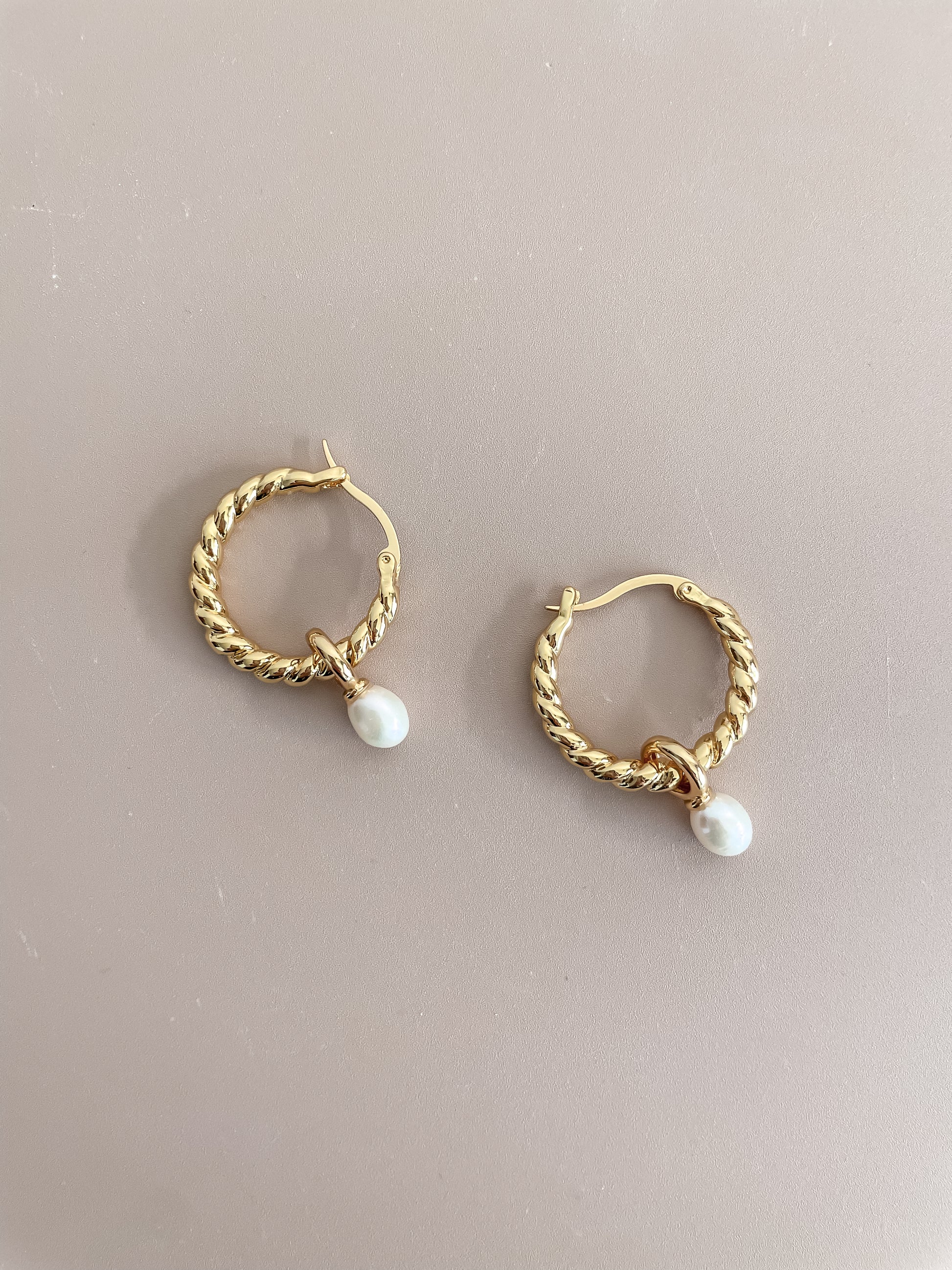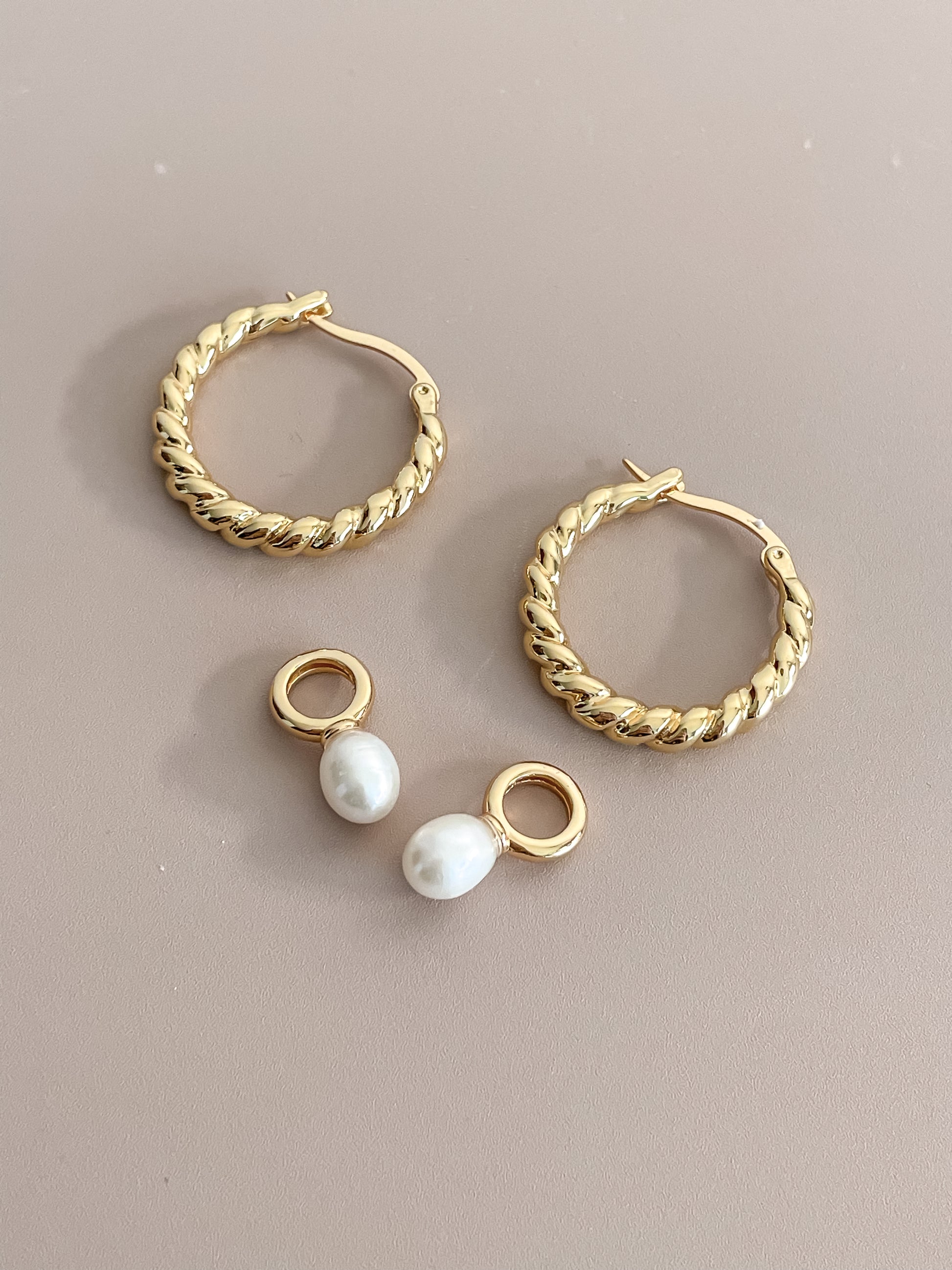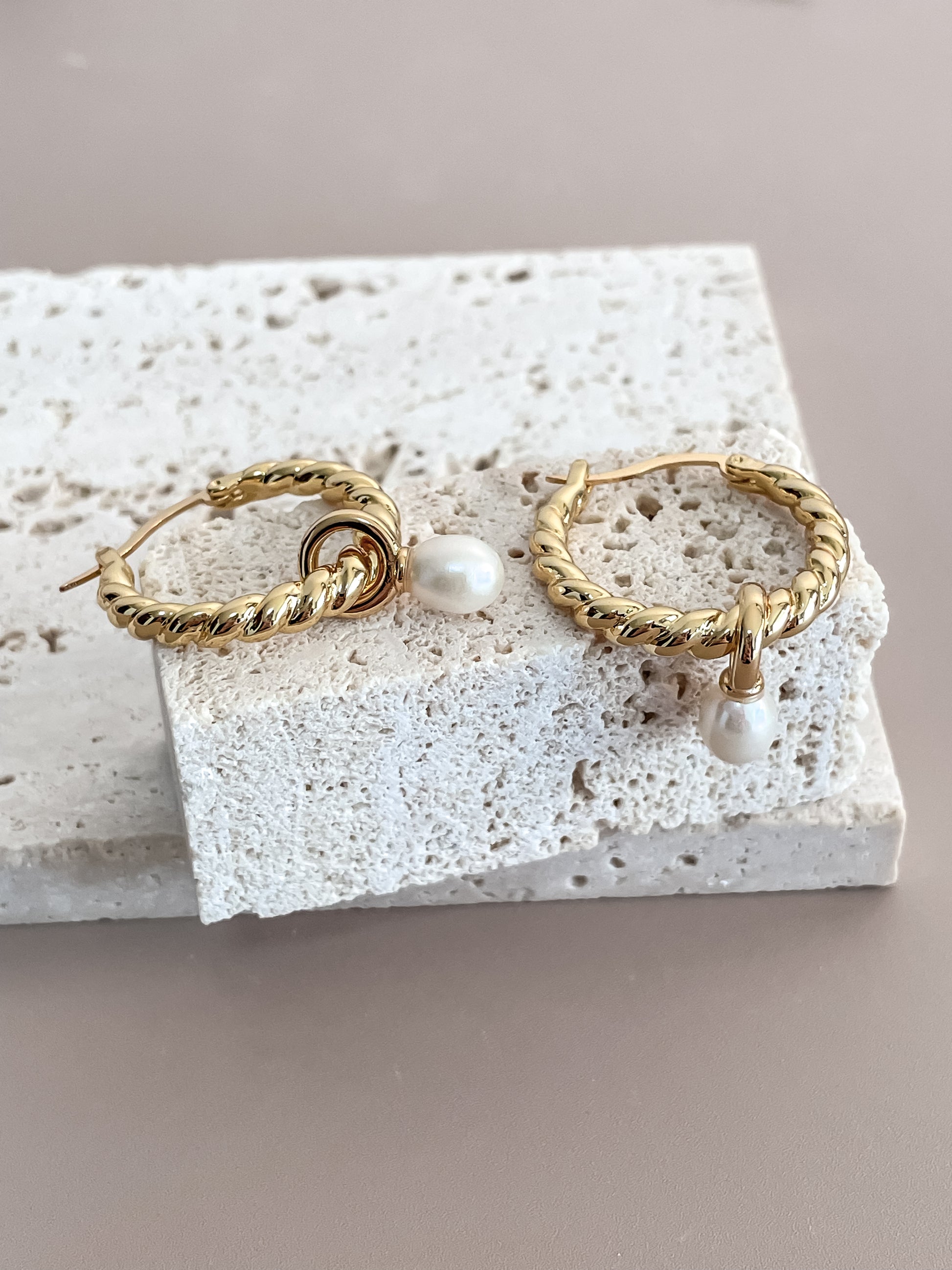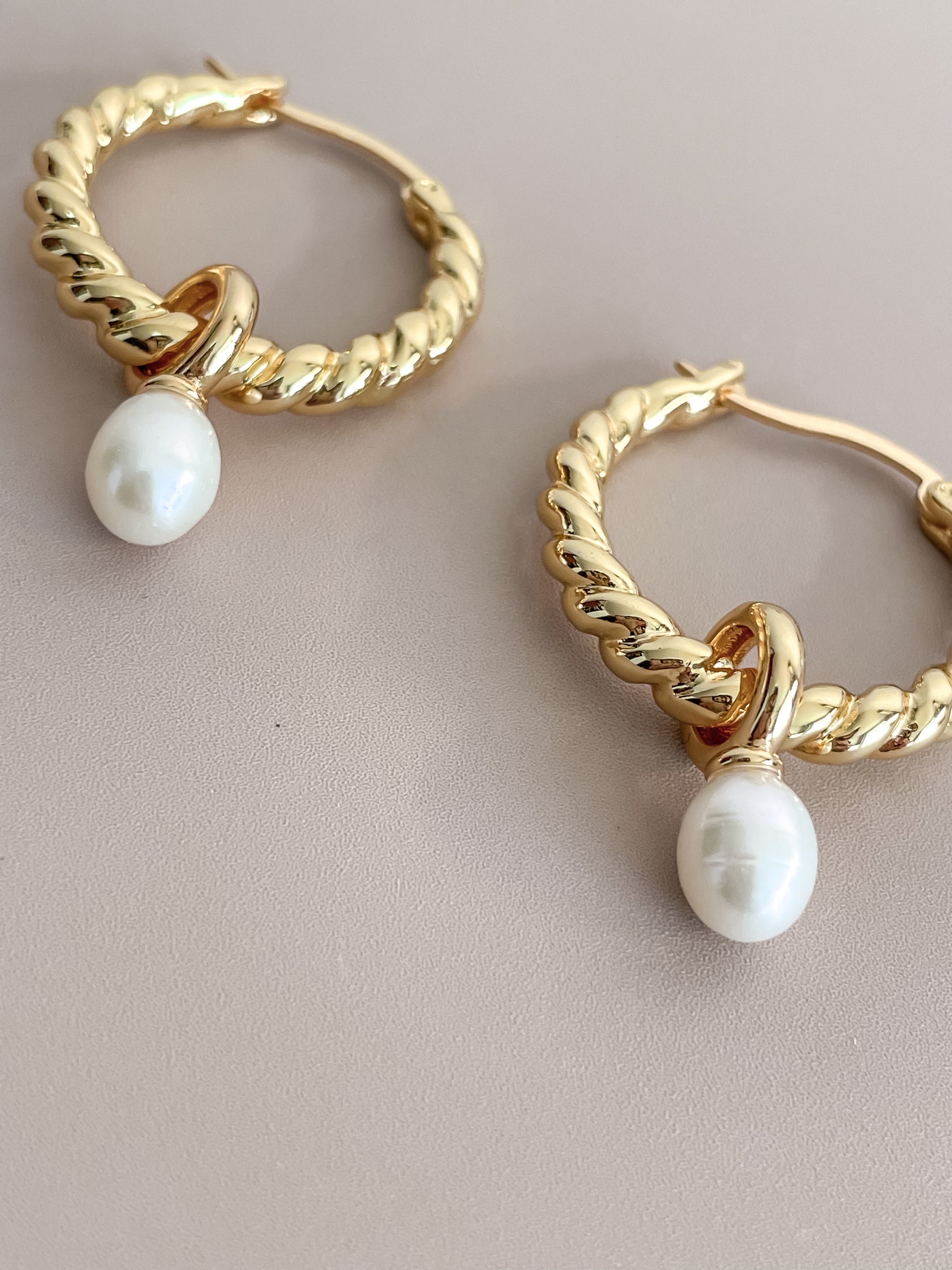 Twisted Rope Hoop Earrings with Pearl Pendant