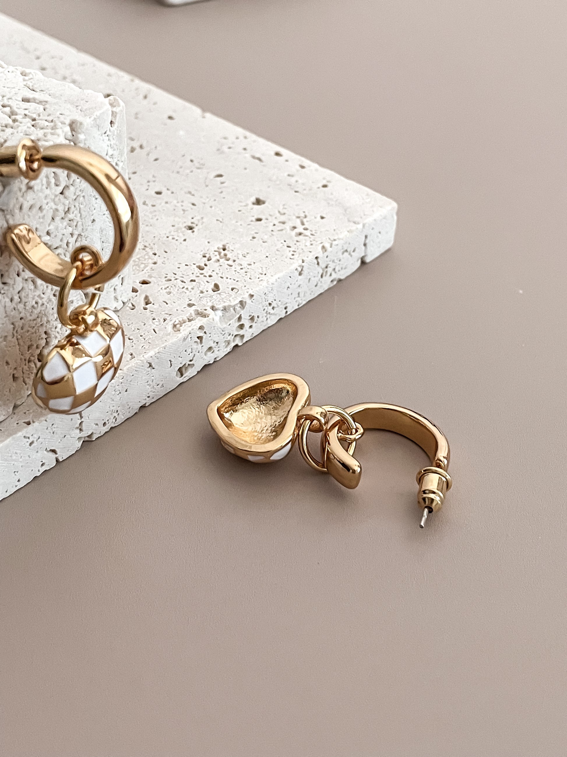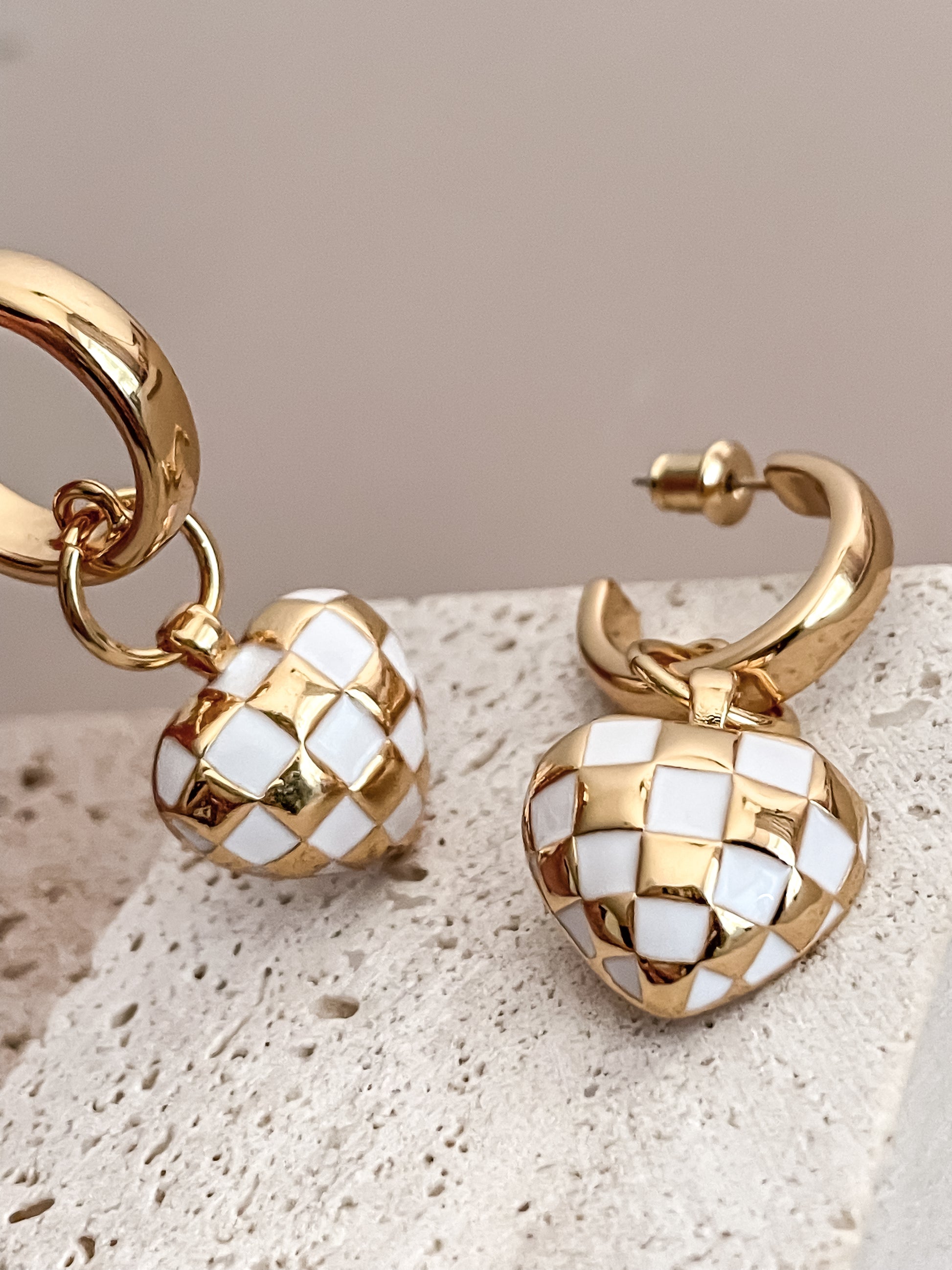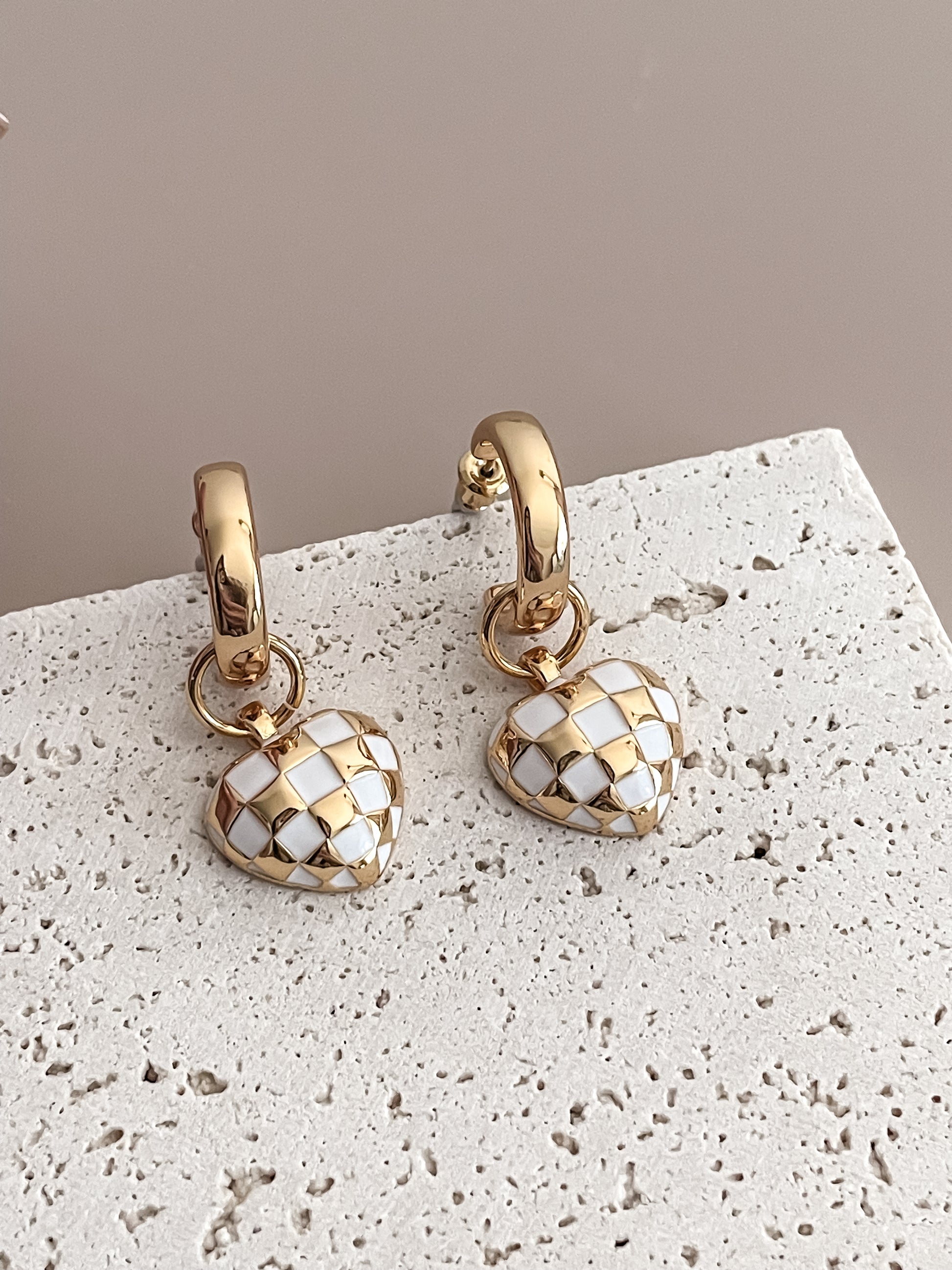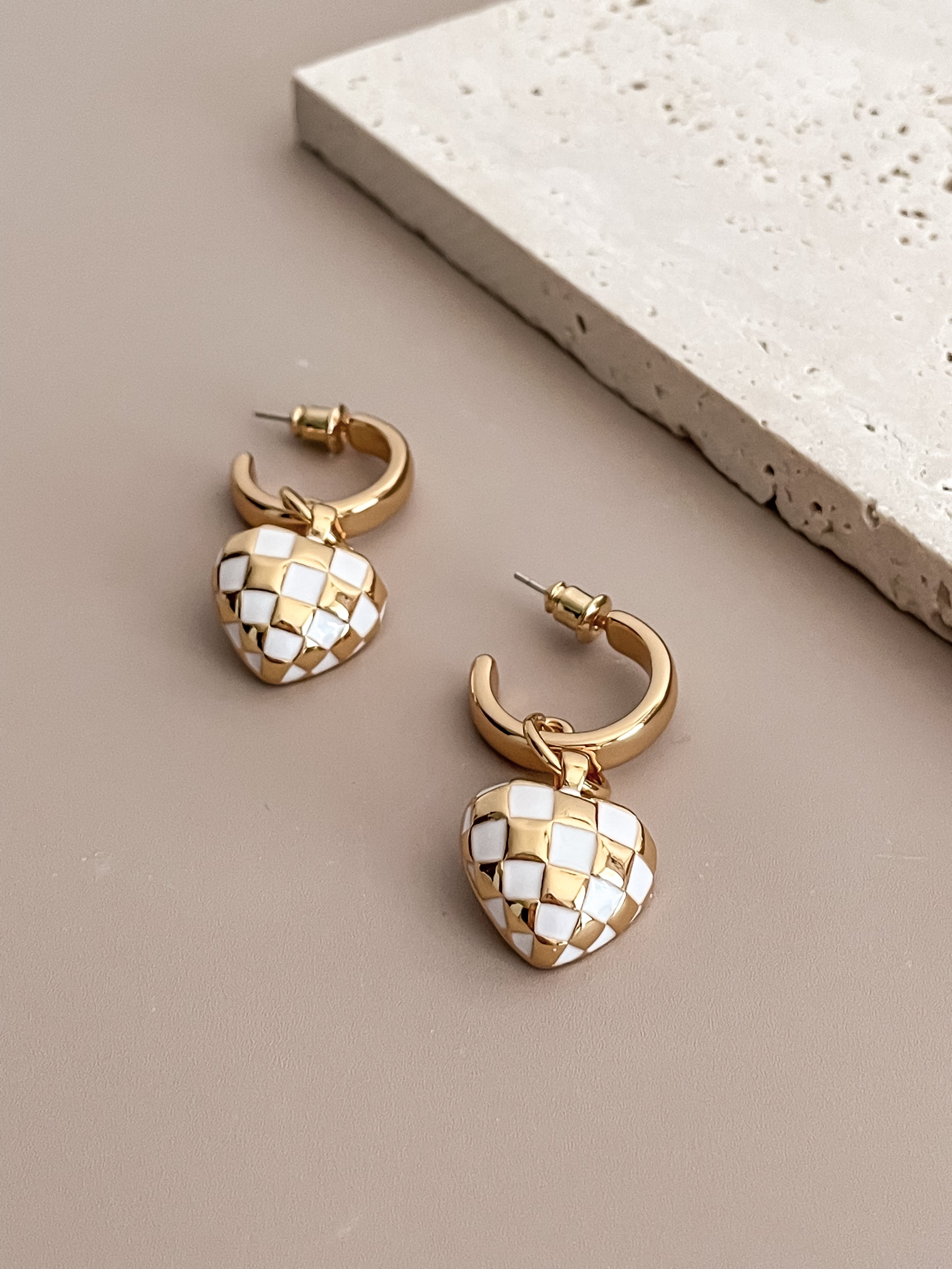 White Checkerboard HeartC-shaped Earrings
