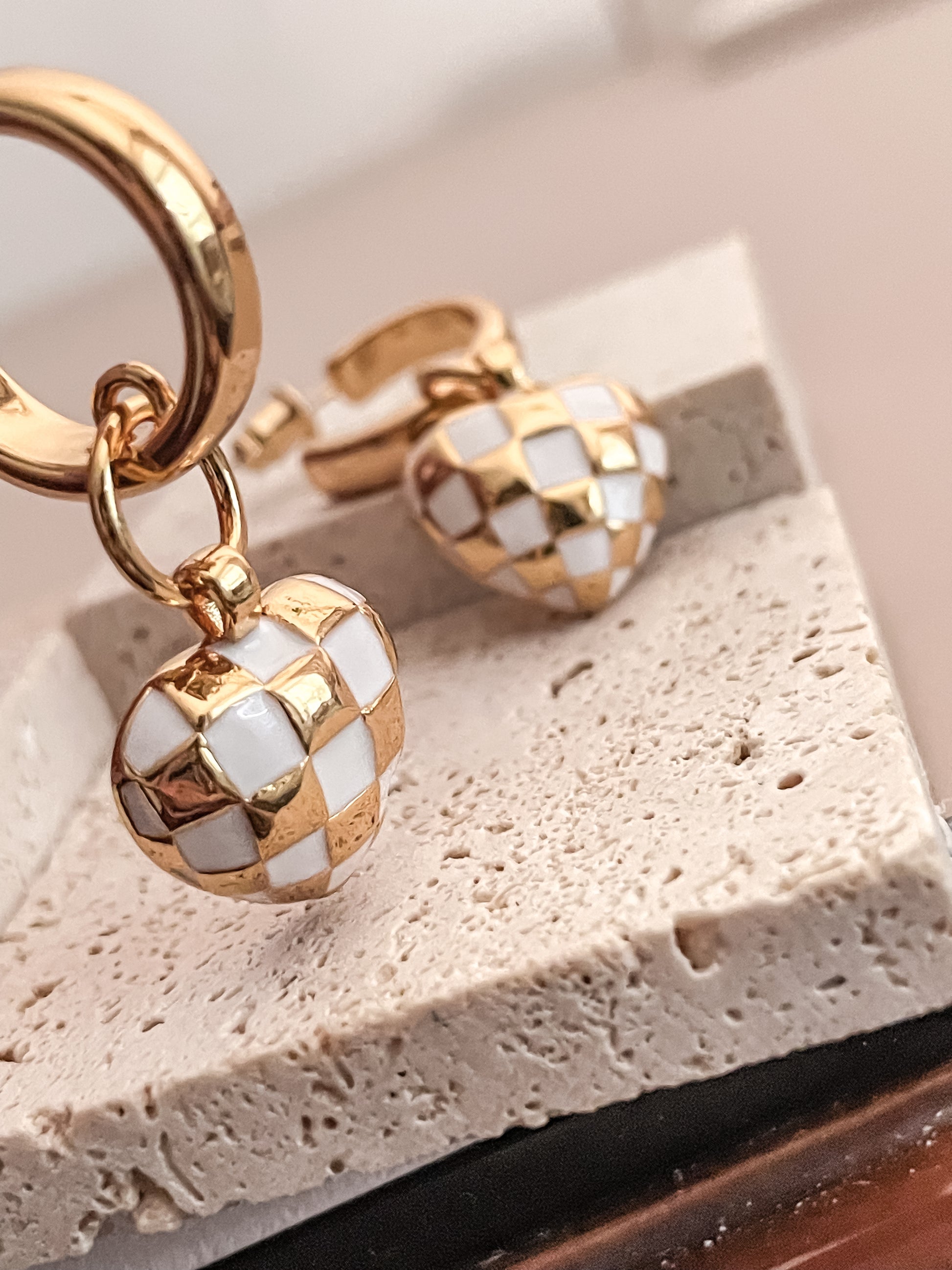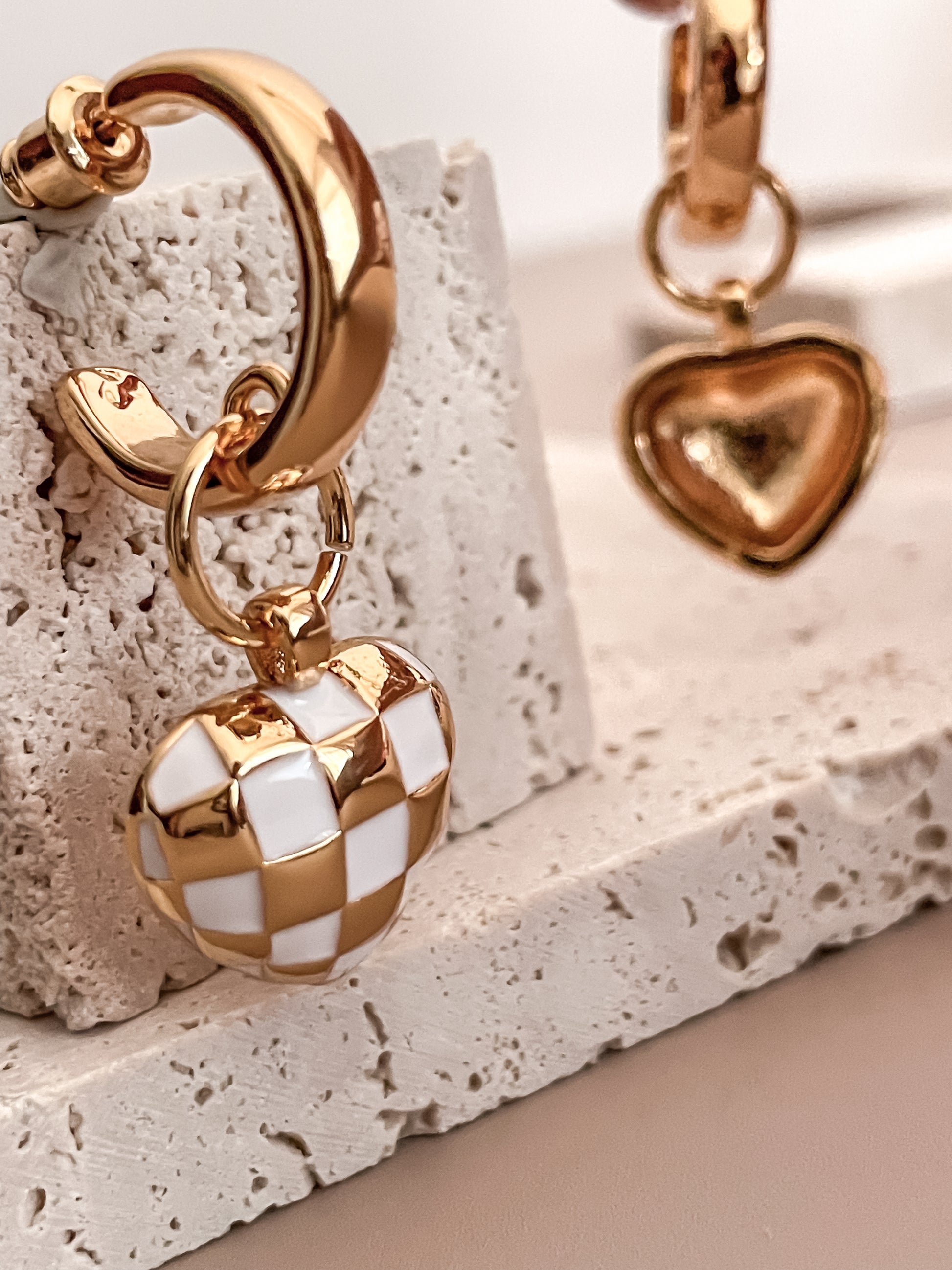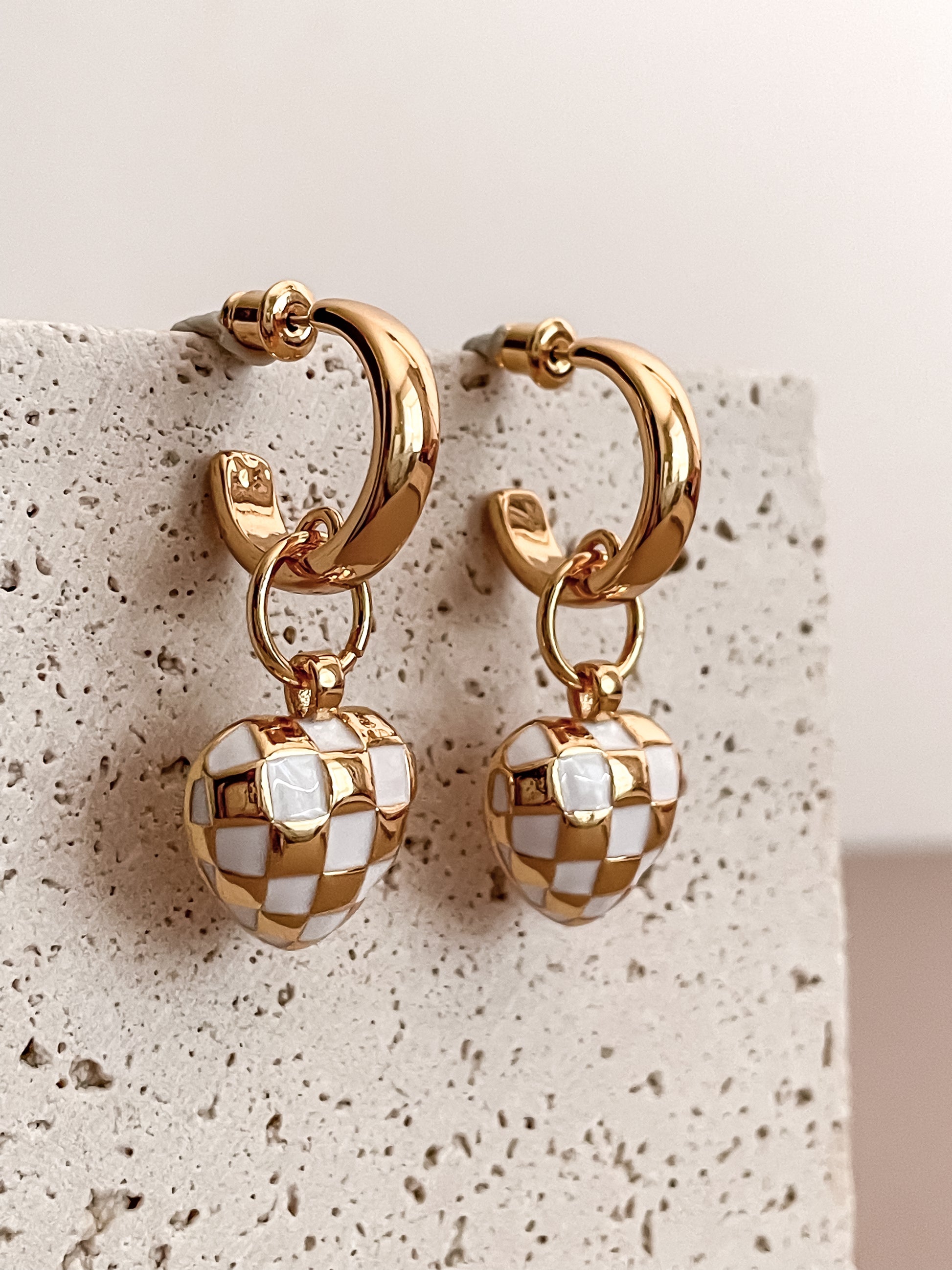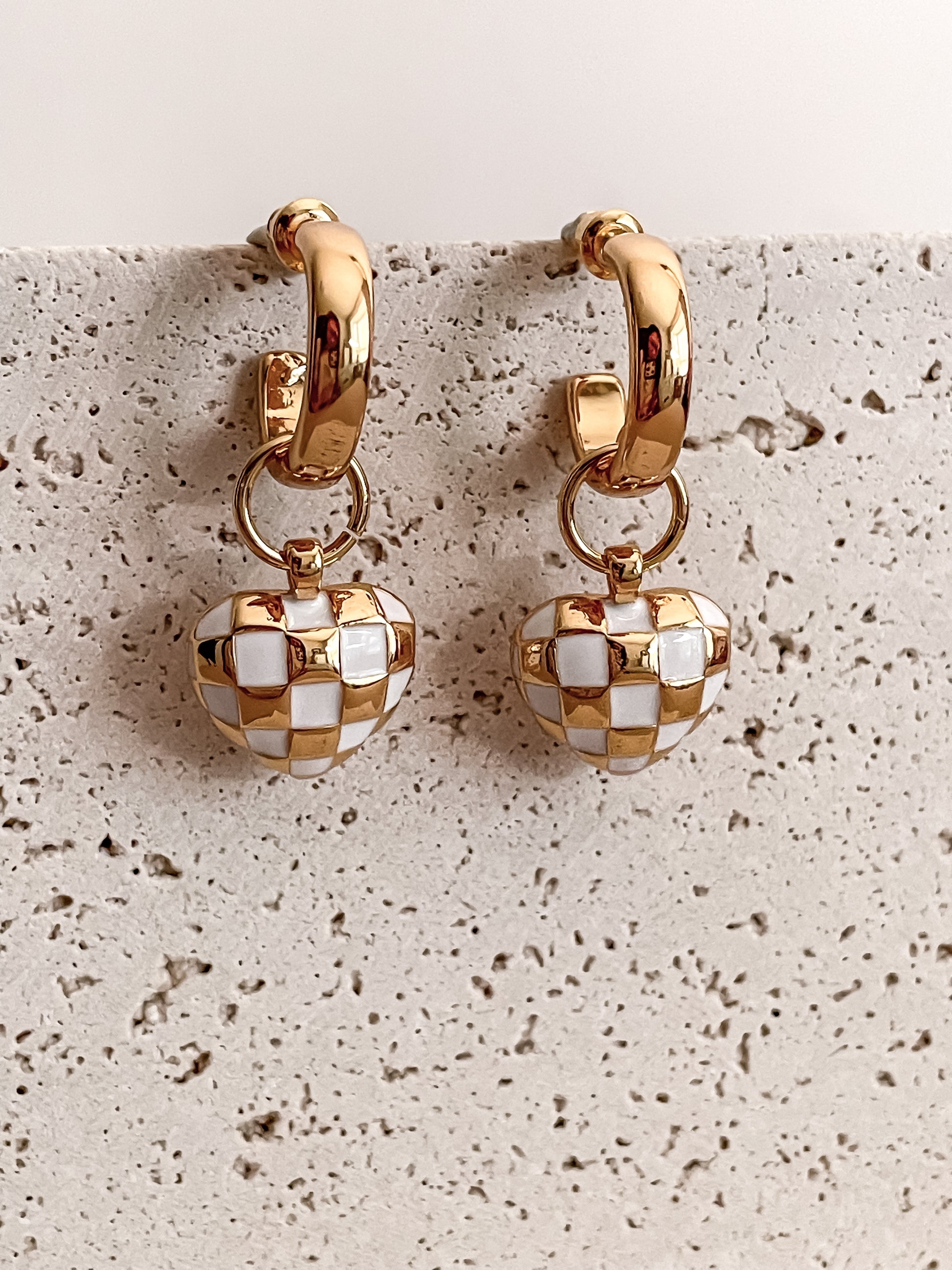 White Checkerboard HeartC-shaped Earrings